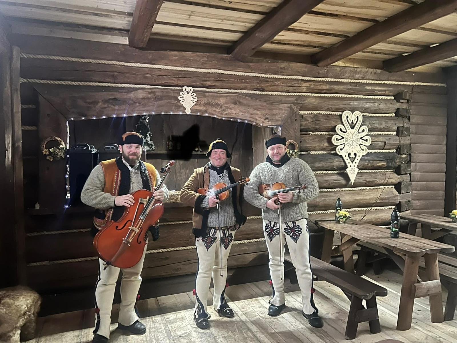 Wspólna biesiada w klimatycznej chacie przy akompaniamencie góralskiej kapeli grającej na żywo.